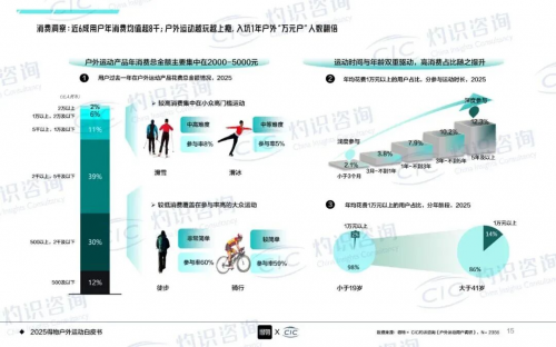 《白皮书》数据进一步印证了Z世代的消费潜力:近六成户外运动用户年均消费金额超过8000元。值得注意的是,消费行为呈现出明显的“进阶性”——“入坑”1年以上的用户中,人均年消费破万的比例较新手群体实现翻番,显示随着参与深入,消费力持续释放。