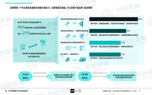 除了强劲的消费实力,Z世代在户外投入上亦表现出显著的持续性。数据显示,96%的用户明确表示未来将继续在装备上投入,其中27%计划进一步增加开支,主要用于装备升级与专业性能提升。