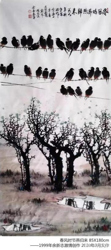 余新志先生的绘画题材广泛 ,尤以花鸟、 山水见长。在花鸟画创作中, 他笔下的禽鸟灵动鲜活,仿佛下一秒就要振翅高飞。他善于捕捉禽鸟的 瞬间神态,通过细腻的笔触和丰富的色彩,将禽鸟的羽毛质感、眼神灵 动都刻画得入木三分。如他笔下的雄鹰 , 目光犀利,羽翼丰满,展现出 一种傲视苍穹的霸气;而那枝头的雀鸟,则小巧玲珑 ,叽叽喳喳,充满 了生活的******。